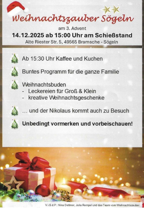 Der Weihnachtszauber Sögeln lädt euch herzlich ein, gemeinsam in die schönste Zeit des Jahres zu starten und den 3. Advent in gemütlicher Atmosphäre zu genießen. Freut euch auf einen winterlichen Nachmittag voller Begegnungen, Lichterglanz und Vorfreude – ideal für Familien, Freunde und alle, die sich gern auf Weihnachten einstimmen möchten.